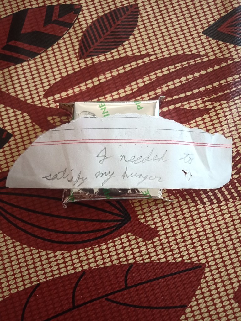 A little mouse left the empty wrapper of the last Waffy with a note.